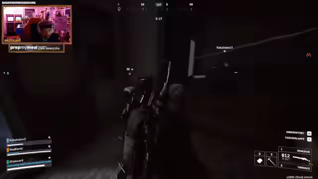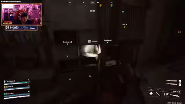 07:27:38Die Spieler befinden sich in einer kritischen Situation, in der sie auf das Drücken eines Knopfes durch ein anderes Team angewiesen sind, um nicht zu sterben. Es wird diskutiert, ob man die Gegner reinlaufen lassen oder abwarten soll. Die Hoffnung liegt darauf, dass das gegnerische Team den Knopf drückt, da ein direktes Eingreifen der Spieler ebenfalls den Tod bedeuten würde. Währenddessen versuchen die Spieler, unentdeckt zu bleiben und die Bewegungen der Gegner zu verfolgen, die sich auf ein Dach begeben. Die Kommunikation mit dem anderen Team scheitert, als versucht wird, eine Kooperation für den Abzug zu erreichen, was letztendlich in einem Kampf mündet.