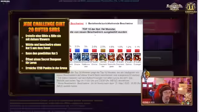 02:42:06Der Streamer begrüßt die Zuschauer zum Summoner's Warstream mit Sample als Profi und Elotrix, der später dazukommt. Es wird die Kooperationsmöglichkeit mit Camtours bzw. Summoners War zum elfjährigen Jubiläum erwähnt. Der Streamer erklärt, dass es bis zu 200 Schriftrollen umsonst, ein Nat5 nach Wahl und Runen geben wird. Es wird betont, dass das Jahresevent bei Summoners War sehr wichtig ist und man es nicht verpassen sollte. Der Streamer bittet die Zuschauer, eine Gilde zu eröffnen, die gefüllt werden kann, da er selbst noch in der Community-Gilde ist. Es wird überlegt, inaktive Spieler aus der Gilde zu entfernen oder eine zweite Community-Gilde zu gründen. Sample gibt Tipps zu Monstern und Zweiterweckungen und empfiehlt den dunklen Inogami. Es wird über die Unübersichtlichkeit von Summoners War gesprochen. Der Streamer fragt, wie viele Charaktere es insgesamt gibt. Sample schätzt, dass es um die 900 sind. Es wird die Gilde Margin League 2 erwähnt und der Streamer bittet die Zuschauer, die Gilde zu füllen. Elotrix kommt zum Stream hinzu und entschuldigt sich für die Verspätung aufgrund technischer Probleme.
