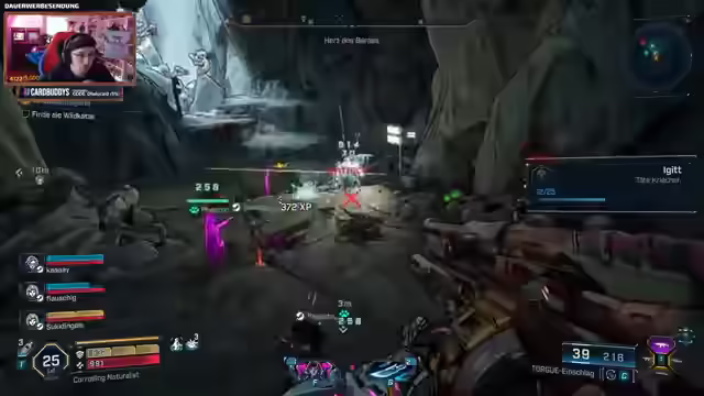 01:33:52Die Gruppe kämpft gegen einen Boss und diskutiert über die besten Strategien, einschließlich des Einsatzes von schwarzen Löchern und dem Fokus auf bestimmte Gegnertypen wie Katzen. Es gibt Probleme mit dem Looten, da die Inventare voll sind, und es wird über das Wegwerfen oder Einlagern von Gegenständen gesprochen. Ein Spieler hat versehentlich seine Hauptwaffe fallen gelassen und sucht nach Ersatz, während die anderen Teammitglieder anbieten, auszuhelfen. Die Qualität des Loots variiert von blau bis golden, und es wird der Wunsch geäußert, einen Verkaufsautomaten aufzusuchen. Die Gruppe erreicht einen Unterschlupf, muss diesen aber erst freiräumen, um eine Kiste zu erhalten. Die Gegner haben ein höheres Level, was den Kampf erschwert. Blitz-Waffen sind effektiv gegen Schilde, während Korrosion gegen Rüstung hilft. Es gibt Schwierigkeiten mit Munition und dem Wiederbeleben gefallener Teammitglieder. Nach mehreren Versuchen gelingt es, den Unterschlupf einzunehmen, indem ein Datapad aktiviert wird, was den Zugang zu Maschinen ermöglicht. Es wird über den Verkauf von Gegenständen und die begrenzten Rückkaufmöglichkeiten gesprochen.