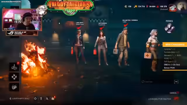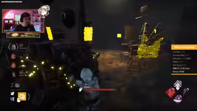 04:55:42Der Fokus wechselt abrupt zu einem komplett anderen Spiel, Dead by Daylight. Die Gruppe beschäftigt sich mit einem Gegner, der sie mit hoher Präzision angreift, was den Verdacht auf einen möglichen Cheaten aufkommen lässt. Die Spieler analysieren seine Spielweise und versuchen, seine Perks wie "Spirit Blossom" zu nutzen, um ihn zu kontern. Der Verlauf der Runde ist von hohem Druck, gezielten Fähigkeiten und teils frustrierenden Misserfolgen geprägt, da der Killer immer wieder unerwartet und zielgenau agiert.