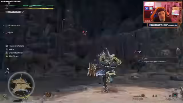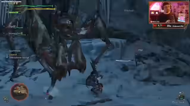 06:29:16Der Streamer stellt fest, dass er in einer Doppelsituation mit zwei Monstern ist, von denen einer bereits geschwächt ist. Er stürmt in den Kampf, wird jedoch von einem Boss, Jinderhat, überrascht, der ihn fast mit einem Schlag eliminiert. Während des Kampfes bemerkt er ein Problem: sein spezieller Mantel ist nicht mehr in der Ausrüstungsliste verfügbar und wird nicht angezeigt, obwohl er ihn angezogen hat. Dies führt zu Verwirrung, und der Streamer kann den Bosskampf nicht erfolgreich abschließen, was seine Frust erhöht und ihn dazu veranlasst, seine Ausrüstung zu überprüfen.