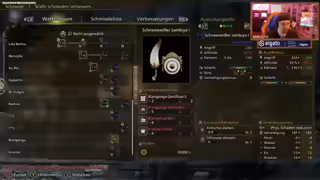 02:49:27Der Streamer spielt hauptsächlich Schwert und Schild, da er noch nichts anderes gefunden hat, was ihm Spaß macht. Er überlegt, Lanze oder Doppelklingen auszuprobieren, findet Doppelklingen aber zu simpel. Der Streamer wechselt gerne die Waffen im Kampf, um Wunden zu verursachen und diese dann mit dem Bogen auszunutzen. Es wird ein Ei gefunden, das zum Lager gebracht werden kann. Der Streamer sucht nach Honig und überlegt, eine Gruppe zum Farmen zu erstellen. Es wird nach einer Lobby gesucht und festgestellt, dass Asmogl noch nicht durchgespielt hat. Diskussion über empfohlene Waffen und den Wunsch, die Morph-Axt gegen die Dual Blades zu tauschen. Es wird erwähnt, dass die Monster nicht einfacher werden und man Monster farmen sollte, um neue Waffen zu craften.
