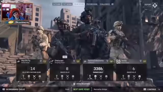 03:50:28Es wird nach Möglichkeit gesucht, die Kills mit bestimmten Waffen zu sehen. Ein Spieler hat vermutlich 1000 von 1700 Kills mit der Shotgun, dies sei aber im Menü nicht ersichtlich. Das Abzeichen-System zeigt nur den Fortschritt in XP, aber nicht die konkreten Kills. Man vermisst Stat-Track-Funktionen, die bei früheren Teilen des Spiels vorhanden waren.