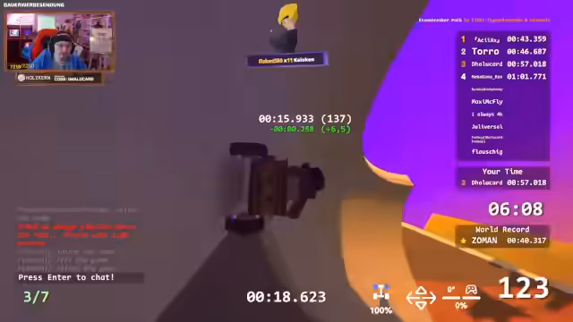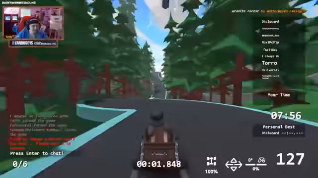 05:14:55Im Stream wird eine Zeepkist-Runde gespielt, bei der der Streamer Schwierigkeiten hat, in die Top 10 zu kommen. Es gibt eine intensive Diskussion über Fahrtechnik, insbesondere über Sprünge und das Bremserhalten in der Luft. Dabei geht es darum, ob Bremsen die Flugweite beeinflusst, was zu hitzigen Wortgefechten und gegenseitigen Beschuldigungen führt. Der Streamer ist frustriert von seinen Zeiten und sucht nach Erklärungen für die großen Zeitunterschiede, vermutet teilweise auch eine Abkürzung auf der Strecke.