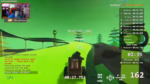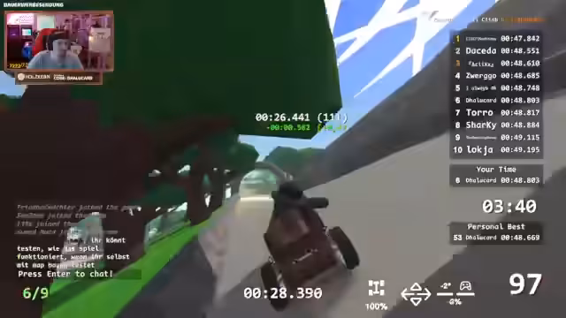 05:42:10In einer neuen Runde gelingt es dem Streamer, seine Zeit zu verbessern und sogar in die Top 10 zu kommen. Er identifiziert eine neue Streckenführung als den Schlüssel für eine bessere Zeit. Die Kommentatoren diskutieren über die Serverauslastung und die Teilnehmerzahl. Es wird der Verdacht geäußert, dass andere Spieler möglicherweise Abkürzungen genutzt haben, was die Zeiten auf den vorderen Plätzen erklärt und für weitere Diskussionen sorgt.