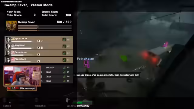06:12:45Das Spiel beginnt in der Swamp-Fever-Kampagne. Das Team 'Bösewichte' startet als Survivor gegen das gegnerische Infected-Team. Die ersten Angriffe der Infected sind jedoch nicht erfolgreich, da die Planung und Ausführung suboptimal sind. Über Voice-Chat geben sich die Survivors gegenseitige Tipps, um die Angriffe abzuwehren und ihre Positionen zu sichern.