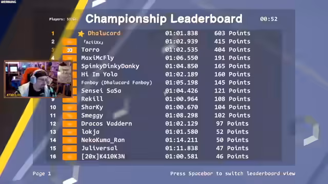 02:42:05Eine neue Strecke, die an eine Minigolfbahn erinnert, sorgt für Verwirrung und Diskussionen. Die Spieler sind unsicher über die richtige Reihenfolge der Runden und die Navigation auf der ungewöhnlichen Map. Es wird erwähnt, dass es sich um eine 'Pausenstrecke' handelt, die nicht zufällig gewählt werden kann, was zu potenziellen Wiederholungen führt. Die Spieler kämpfen weiterhin mit den anspruchsvollen Zeepkist-Strecken, wobei der Fokus auf dem Meistern von schwierigen Kurven und dem Vermeiden von Fehlern liegt. Die 'Wurst'-Kurve und andere spezifische Passagen werden als besonders herausfordernd empfunden. Die Spieler versuchen, ihre Zeiten zu verbessern und sich in der Rangliste nach oben zu arbeiten, während sie gleichzeitig die hohen Weltrekordzeiten auf den älteren Strecken bewundern und sich fragen, wie diese erreicht wurden.