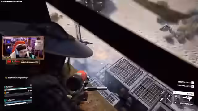 05:38:04Ein Heißluftballon spuckt Loot aus, und es kommt zu Schusswechseln bei den Filmstudios. Die Spieler diskutieren über die neuen Folgen von Stranger Things, wobei ein Spieler bedauert, die letzte Staffel nicht am Stück durchgehalten zu haben. Es kommt zu einem Kampf mit einem Sniper auf einem Dach, und ein Alien wird fast ausgeschaltet. Eine lila Strahlenkanone wird gefunden, und ein Gegner im Ballon wird eliminiert. Die Gruppe wird von einem Auto überfahren, kann sich aber wiederbeleben und den Angreifer ausschalten. Ein weiteres Team greift an, und es kommt zu einem intensiven Kampf mit mehreren Gegnern.