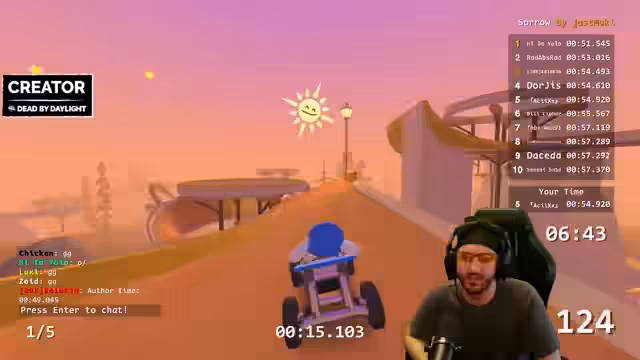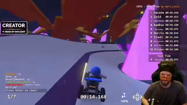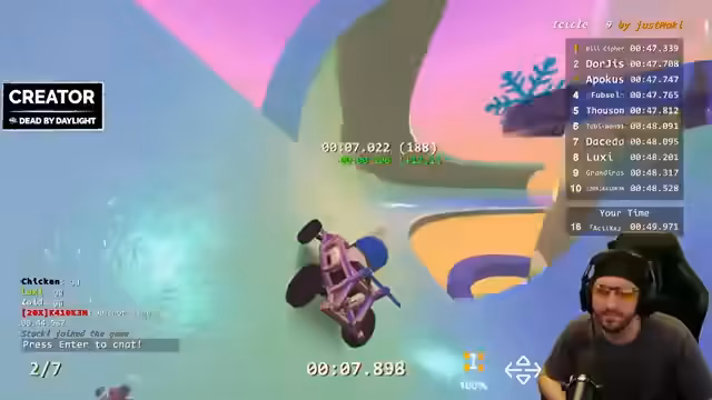 Dhalucard stellt sich in Zeepkist schwierigen Sprüngen und Speedchecks. Diskussionen über Streckendesign, Physik und Taktiken. Smalltalk über Eis, Volksentscheide und Zuschauer-Anekdoten lockern die Atmosphäre auf. Karten, Halloween-Pläne und Kooperationen werden thematisiert. Es folgen Steamer-Cards, Kindheitserinnerungen, Trainingserinnerungen, Streaming-Anfänge, Brillenprobleme und spontane Spielentscheidungen.