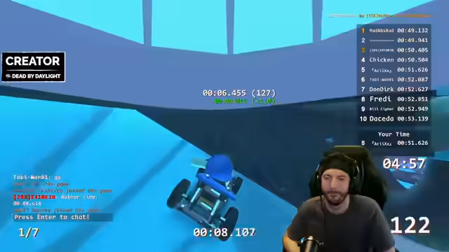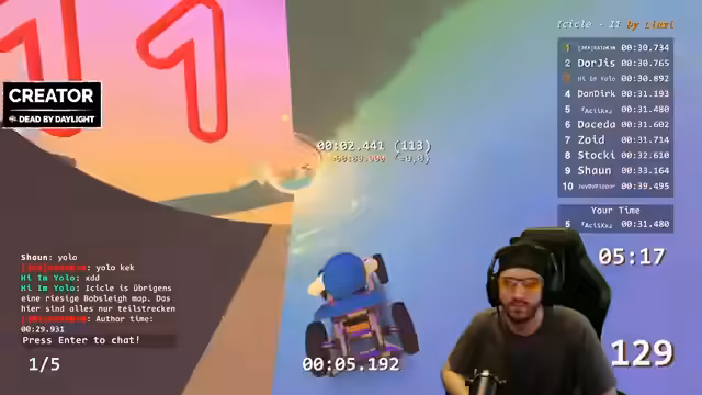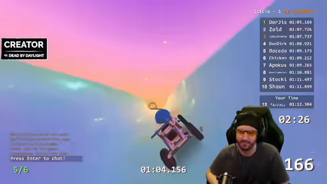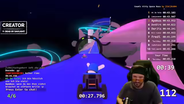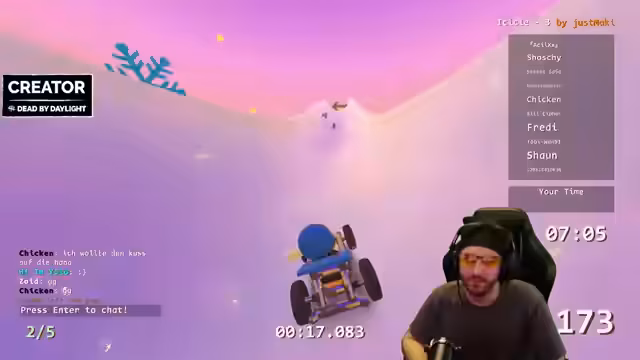 02:05:25Die Strecken des Tages werden bewertet, wobei Eisstrecken als schwierig, aber auch als reizvoll empfunden werden. Es wird der Plan gefasst, nächste Woche auf der aktuellen Strecke weiterzufahren und die Nummer der Strecke für die September-Playlist zu notieren. Es wird die nächste Aktivität angekündigt: viermal Escape Street mit Clirt, Marder und Oweiaia. Es wird überlegt, was nach Zeepkist gespielt werden soll. Es wird erwähnt, dass jemand von einem geplanten Vierer-Team abgesagt hat und die Möglichkeit diskutiert, sich Terste bei PUBG anzuschließen. Der Chat wird nach seiner Meinung gefragt, ob er Lust auf PUBG hat. Es wird kurz die Win-Challenge vom Vortag angesprochen und die Spende von 416 Euro für das Tierheim Berlin durch Darkhanubis erwähnt, was als 'geisteskrank' bezeichnet wird. Abschließend wird angekündigt, zu Dead by Daylight (DbD) zu wechseln, um Blood Points zu sammeln und nebenbei etwas zu essen.