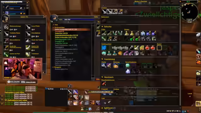 13:39:01Der Streamer hilft einem Gildenmitglied dabei, seine Ausrüstung zu enchantieren. Es geht um das Besorgen von Materialien wie feuriger Waffe, Stamina auf Armschienen oder Beweglichkeit. Der Prozess wird offen im Stream gezeigt, wo der Streamer direkt im Voice mit dem Gildenmitglied kommuniziert und die benötigten Rezepte und Materialien aus der Gildenbank oder persönlich zur Verfügung stellt.