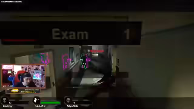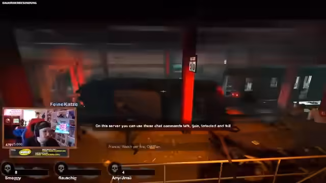 03:44:50Das Spiel Left 4 Dead 2 startet mit den eingeteilten Teams auf der Mercy Hospital Map. Das Team von Flauschi, Terz, Jinzy und Maggie muss sich gegen Spinky, Schmuse, Katze und Klör behaupten. Die Runde ist geprägt von hektischem Action und strategischen Fehlern, insbesondere bei den Infizierten, die zu spawnen beginnen. Trotz dieser Fehler überleben die Survivor knapp und analysieren im Nachgang die Spielzüge, um für zukünftige Runden zu lernen.