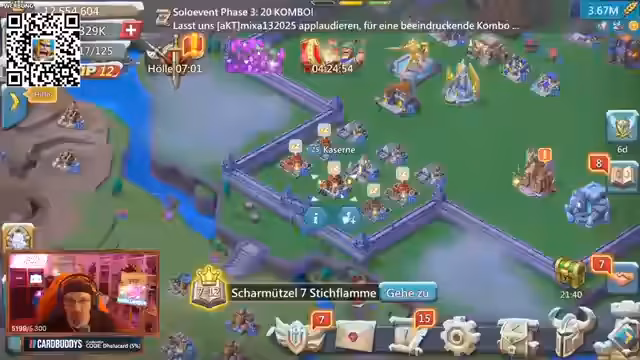 04:49:24Der Streamer kündigt eine Community Challenge für Lords Mobile an. Für jeden Spieler, der seiner Gilde beitritt, gibt es ein Sub-Gift, mit dem Ziel von 75 Teilnehmern. Wenn 50 Spieler ihre Burg auf Level 8 und 12 Spieler auf Level 22 upgraden, wird eine Prämie von 500 Euro ausgeschüttet, die vollständig in den Charity-Fluss geht. Es wird ein neuer Server, 1729, empfohlen, um mit der Gilde zusammenzuarbeiten.