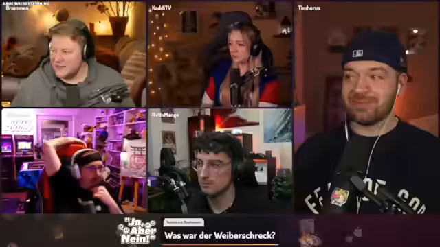06:56:27Die Diskussion um den „Gummihund“ geht weiter, wobei die Teilnehmer nun im Bereich Essen und Küchenutensilien suchen. Sie spekulieren über „Kalter Hund“ oder ein zähes Stück Fleisch. Schließlich kommt die Gruppe auf die Idee, dass es ein Küchenutensil aus Gummi sein könnte. Dalu erwähnt, dass er von einem „Teigschaber“ gehört hat, und Tim bestätigt, dass dies die richtige Antwort ist. Die erste Frage ist somit gelöst, und Tim zeigt sich stolz auf die Teamarbeit. Anschließend leitet er zur zweiten Frage über: „Was war der Weiberschreck?“ Die Teilnehmer vermuten einen historischen oder mythologischen Kontext und überlegen, ob es sich um ein Event handelt, ähnlich der Weiberfastnacht. Brammen erklärt das Konzept der Weiberfastnacht, während Tim Hinweise gibt, dass es sich um ein „altdeutsches Ding“ handelt und im Mittelalter angesiedelt sein könnte. Die Diskussion geht in verschiedene Richtungen, von Hexenverbrennungen bis hin zu einem Bullen mit Glocke, der Kühe begattet. Tim nutzt die Gelegenheit, um die Teilnehmer zu „baiten“, was zu amüsanten Verwirrungen führt.