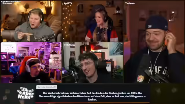 07:12:35Die Diskussion um den „Weiberschreck“ spitzt sich zu, wobei Dalu mit der Vermutung, es habe etwas mit der Hexenzeit zu tun, am nächsten dran ist. Tim bestätigt, dass es nicht negativ ist, aber die Teilnehmer bleiben bei der Idee eines schlimmen Ereignisses. Nach weiteren Spekulationen, die von Geburten bis hin zu Hochzeiten reichen, lenkt Dalu die Aufmerksamkeit auf eine Glocke, die zu einer bestimmten Uhrzeit geläutet wird, um Frauen von der Straße zu schicken. Tim bestätigt, dass dies der richtige Weg ist. Schließlich enthüllt er die Lösung: Der Weiberschreck war zu bäuerlicher Zeit das Läuten der Kirchenglocken um 11 Uhr, das den Bäuerinnen auf dem Feld signalisierte, dass es Zeit war, das Mittagessen zu kochen. Die Teilnehmer reagieren überrascht und amüsiert über die historische Bedeutung. Tim betont, dass es Teamarbeit war, die zur Lösung führte, und bereitet die nächste Frage vor, während er erneut versucht, seine Audioeinstellungen zu optimieren.