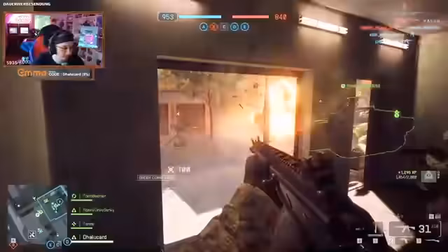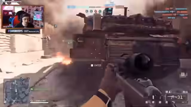 06:34:30Der Streamer hat die Mission, insgesamt 3.000 Schaden an einem Panzer zu reparieren, und sucht daher ständig nach beschädigten Fahrzeugen. Er setzt Bewegungsmelder und Aufklärungswerkzeuge ein, um Feinde aufzuspüren, bevor er selbst angegriffen wird. Ein Rennwagen wird ihm von einem gegnerischen Spieler mit einer Schrotflinte zum Opfer gefallen. Nach einem plötzlichen Absturz des Spiels, der den Reparaturfortschritt gefährdet, wechselt er die Squad-Klasse, um die Aufgabe effektiver zu erfüllen.