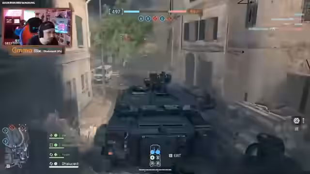 05:51:44Zu Beginn der Runde fokussiert sich das Spiel intensiv auf Panzeraktionen. Der Streamer identifiziert ein fehlgeschlagenes Spawnen des eigenen Panzers in der Basis und stellt fest, dass dieser keine Reaktion zeigt. Nachdem ein anderer Spieler den Panzer genommen hat, übernimmt der Streamer die Rolle des Reparateurs, um den beschädigten Panzer wiederherzustellen. Er unternimmt mehrere Versuche, den Panzer zu reparieren, wobei er sich selbst als Versorger positioniert und die Leisten des Panzerzustands beobachtet.