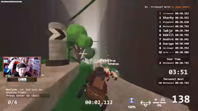 04:02:07Der Streamer konzentriert sich auf die technische Seite des Zeepkist-Fahrens und diskutiert über die Bedeutung von Schwung, Geschwindigkeit und der korrekten Linienwahl. Er probiert verschiedene Wege, um schnellere Zeiten zu erzielen, scheitert aber oft an fehlendem Speed oder fehlerhaften Sprüngen. Insbesondere eine als "Totenkopf" bezeichnete Strecke berecht ihm große Schwierigkeiten und führt zu wütenden Reaktionen.