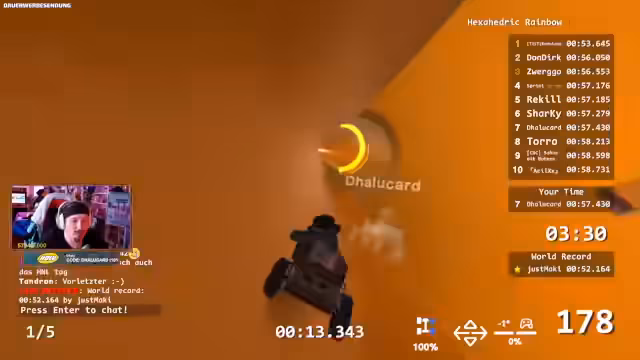 04:50:58Der Fokus liegt auf der Fahrtechnik und den taktischen Kniffen, um schneller zu werden. Es werden Tricks wie das Rückwärtsfahren und das Nutzen von 'Hidden Tactics' diskutiert, um in der Rangliste nach oben zu kommen. Der Streamer versucht, einen Vorsprung herauszufahren und konzentriert sich darauf, den Speed in bestimmten Kurven zu optimieren, um einen Mega-Sprint zu ermöglichen. Der Druck steigt, da knappere Runden für einen Sieg notwendig sind.