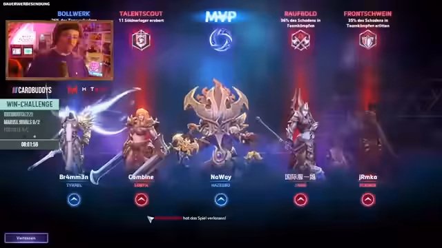 08:37:49Nach einer intensiven und knappen Runde im Hotz-Spiel, die mit einem Sieg endet, wird das Spiel als frustrierend und anstrengend empfunden. Es wird über den Wechsel zu einem anderen Spiel nachgedacht. Vorschläge sind Marvel Rivals, Smite oder Fortnite, wobei Marvel Rivals aufgrund des Hypes und der Spielbarkeit auf dem Laufband favorisiert wird. Die Challenge ist damit vorerst beendet.