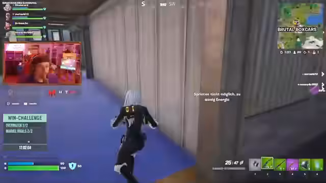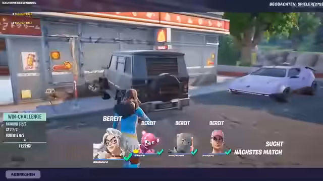 13:03:41Nach zwei knapp verlorenen Runden in Fortnite wird über das Fortsetzen der Challenge debattiert. Ein Spieler schlägt vor, bei 12 Stunden aufzuhören, da die Konzentration nachlässt. Es wird diskutiert, ob Fortnite fair in der Win-Challenge ist, da es viele Spieler gibt. Als Alternative für die nächste Challenge werden Spiele wie S4 League oder PUBG vorgeschlagen, um die Variety zu erhöhen und die Frustration zu reduzieren.