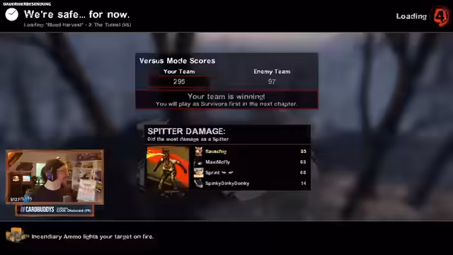 03:12:44Das Team macht langsame Fortschritte in der Map trotz des Mad-Kits von Flauschi. Katze ist angespuckt und der Hunter könnte hier oben holen. Die Spieler koordinieren sich, um die Mission erfolgreich abzuschließen, während Boomer und andere Infizierte versuchen, ihre Gegner zu überraschen und zu schwächen. Die Situation bleibt angespannt, da die Infizierte strategisch platziert sind und koordinierte Angriffe erforderlich sind.