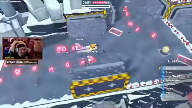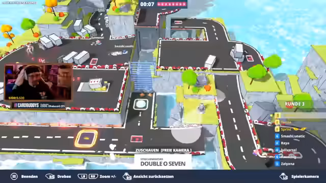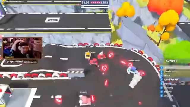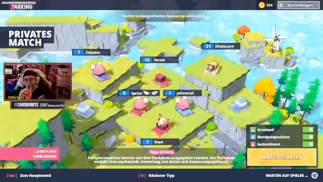 01:46:34Mehrere Zuschauer wie Terz, Franzi und Sayana treten in einer privaten Lobby gegeneinander an. Das Ziel ist es, als Erster alle versteckten Parkplätze auf einer Map zu finden. Die Rennen sind chaotisch und voller Action, da die Spieler sich gegenseitig rammen und behindern. Während einige Parkplätze offensichtlich sind, müssen andere mit speziellen Techniken wie Boostern und Sprüngen erreicht werden, was die Runde zu einer kniffligen Herausforderung macht.