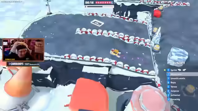 03:51:05Die Gruppe spielt nun den Rundenmodus, in dem langsamste Spieler nach jeder Runde ausscheiden. Dabei wird der Wettbewerbscharakter des Spiels deutlich, da Items wie Raketen zur Verfügung stehen, die andere Spieler stören. Der Streamer findet den Modus zwar faszinierend, aber problematisch, da nicht alle Mitspieler durchgehend aktiv sind. Der Ausstieg einzelner Spieler führt dazu, dass nur noch wenige weitermachen können, was die Spielzeit für die Verbleibenden verkürzt und das Erlebnis für Zuschauer und abgehängte Spieler langweilig macht.