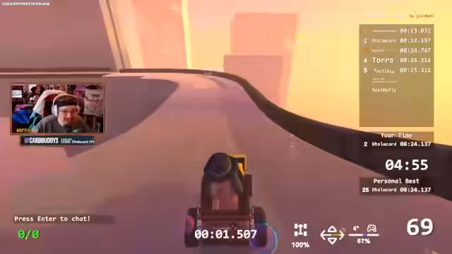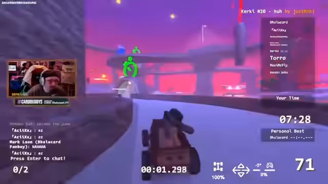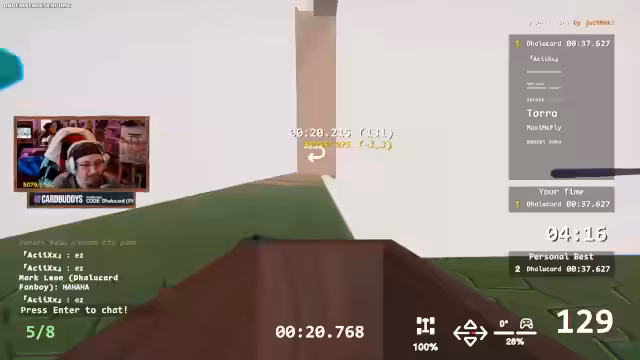 01:20:23Nach dem Abenteuer in 'Don't Fall' wechselt der Streamer zum Spiel Zeepkist. Das Ziel ist nun, eine bestimmte, anspruchsvolle Strecke zu meistern. Die Community ist bereits aktiv und versucht sich an der Strecke. Es zeigt sich schnell, dass das Auto-Handling und das Erreichen der Checkpoints eine große Herausforderung darstellen, insbesondere da die Strecke einiges an Geschwindigkeit und präzisen Manövern erfordert.
