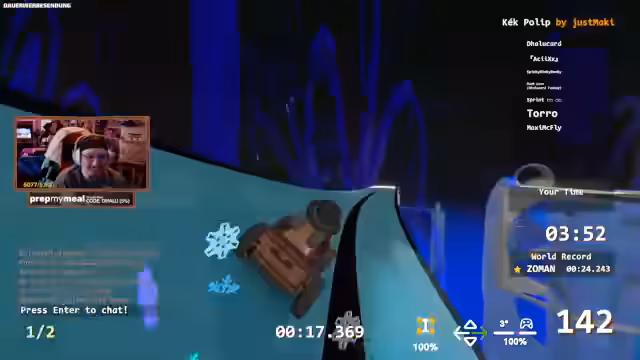 03:08:17Nach dem Scheitern an den Eisabschnitten wenden sich die Teilnehmer abwechslungsreicheren Strecken zu. Es werden strategische Wege mit Seifenkisten und Speed-Pads gefunden, um schneller voranzukommen. Besonders der Weg über eine Seifenkiste in einen Dreher und anschließend in einen Stopper wird als effizient identifiziert und mehrmals getestet, um die bestmögliche Zeit zu erzielen.