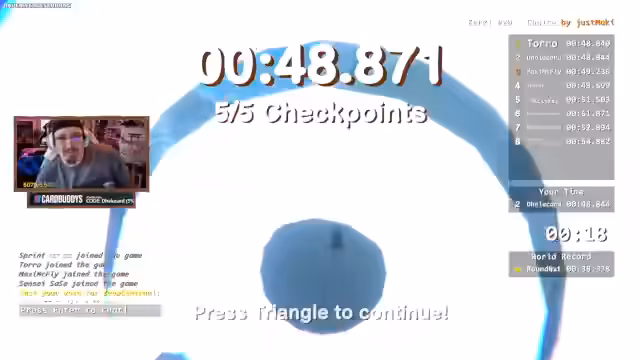 00:55:55Nachdem er trotz perfektem Start an einem kritischen Sprung scheitert, gibt der Streamer vorläufig den Versuch auf, den WR zu holen. Er konstatiert, dass der Lauf bereits sehr gut war und das Potenzial für eine Bestzeit existierte. Aufgrund der technischen Probleme mit dem Spiel ist der Speedrun für heute beendet. Der Streamer denkt bereits an neue Projekte wie einen eventuellen Hitman-Stream und bittet seine Community um Feedback für kommende Spiele.
