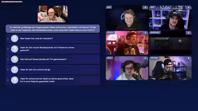 04:32:04Eine neue Quizrunde startet mit einer Frage von 'gutefrage.net', zu der drei Antworten gegeben werden. Die Teilnehmer müssen die Originalfrage erraten. Die Antworten lauten: 'Sicherlich als kleiner Junge oder in der Jugend', 'Ja, mindestens eins' und 'Aus dem Spiel heraus noch nicht'. Die Teilnehmer sind verwirrt und finden die Frage schwierig. Es werden verschiedene Vorschläge diskutiert, darunter Fragen zu Haustieren, Pokémon-Boosterpacks, Manuel Neuer und UNO. Einige Teilnehmer äußern Bedenken hinsichtlich der Logik der Antworten und der Formulierung der Frage. Paul entscheidet sich für eine Antwort aufgrund eines Schreibfehlers, während andere auf Pokémon oder Fußball tippen. Bram erklärt seine Überlegungen zu Manuel Neuer und einem möglichen Eigentor.