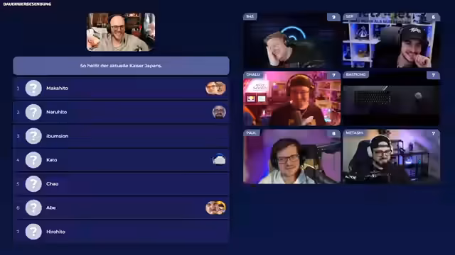 05:10:37In der finalen Quizrunde müssen die Teilnehmer den aktuellen Kaiser von Japan nennen, wobei nur der Vor- oder Nachname gesucht wird. Es werden verschiedene Namen vorgeschlagen, darunter 'Makahito', 'Naruhito', 'Ibumsion', 'Kato', 'Ciao', 'Abe' und 'Hirohito'. Bram erinnert sich, dass Abe Ministerpräsident war und vermutet, dass Dalu mit seinen Vorschlägen baitet. Metaschi erwähnt den Film 'Last Samurai' und erinnert sich an den Namen 'Naruhito'. Basti schließt Dalus Vorschläge aus und wählt 'Kato'. Am Ende stellt sich heraus, dass Metaschi mit 'Naruhito' richtig liegt.
