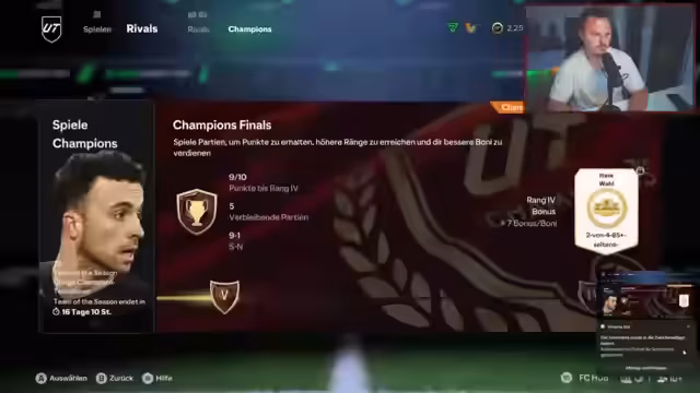 02:51:24Der Streamer diskutiert über die Entscheidungen, Spieler zu verschenken, da ihm neun Siege reichen und er 'lieb' sei. Er zeigt sein aktuelles Team und äußert sich über seine Belohnungen, die ihm 'eher egal' sind. Er kritisiert Messi als 'kleinen Schlumpf' und 'zweikampfschwach' und vergleicht seine eigene Körpergröße mit der anderer Spieler. Der Streamer beginnt eine neue Runde mit dem Ausspruch 'Oh Waldorf Mannheim', was den Start einer neuen Aktivität oder Spiels anzeigt.