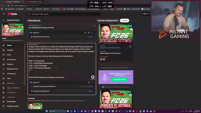00:26:23Es wird davon abgeraten, FIFA über Steam zu kaufen, wenn ohnehin ein anderer Launcher benötigt wird, da dies zu unnötigen Problemen führen kann. Stattdessen wird empfohlen, das Spiel direkt über den entsprechenden Launcher zu beziehen oder es als externes Spiel in Steam hinzuzufügen. Der Alert im Stream funktioniert immer noch nicht richtig. Die Behebung des Problems wurde jedoch aufgrund der höheren Priorität des Settings-Videos zurückgestellt. Es wird erwähnt, dass der Streamer einen Podcast aufnimmt, in dem er den Ausgang des Frankfurt-Spiels richtig vorhergesagt hat. Zuschauer werden gebeten, das Settings-Video anzusehen, da dort alle relevanten Informationen zu FPS, GPU, CPU und LAT erklärt werden. Es wird klargestellt, dass das Video alle relevanten Settings Schritt für Schritt durchgeht und eine Kapiteleinteilung enthält.
