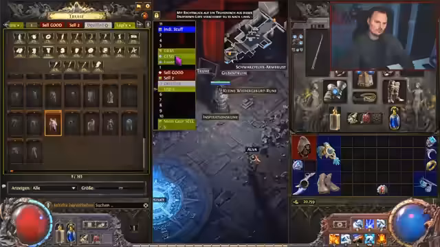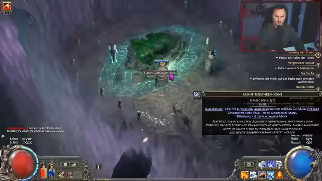 02:59:11Der Build wird im Tempel getestet, wobei Leere Tätowierungen für Widerstände und Geschicklichkeit genutzt werden. Die Bedeutung von Widerständen (Blitz, Feuer, Kälte) wird betont, um Schaden zu reduzieren. Es wird über Diff-Drops und Tempel-Läufe gesprochen, wobei der Fokus auf Upgrades für Rüstung und Energieschild liegt. Diskutiert wird auch, ob Flächenschaden oder Schadenssteigerung priorisiert werden soll, während Angriffsgeschwindigkeit und Reichweite als wichtig eingeschätzt werden.