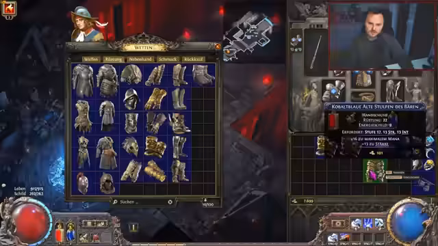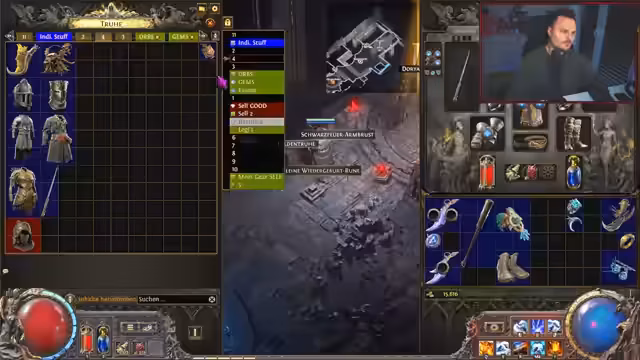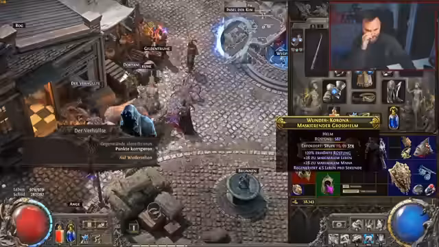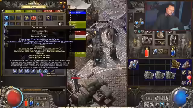 04:28:42Der Streamer diskutiert Herausforderungen bei der Ausrüstungssuche, insbesondere bei der Suche nach spezifischen Gegenständen wie dem 'Blinden'. Er analysiert Ring-Eigenschaften wie erhöhten physischen Schaden, Kälteschaden und Lebensregeneration pro getötetem Gegner. Dabei optimiert er seine Ausrüstung durch Umsortieren in der Truhe und bewertet Eigenschaften wie Energieschild und Widerstände. Technische Anzeigefehler werden erwähnt, aber der Fokus liegt auf der gameplay-bezogenen Materialbeschaffung.