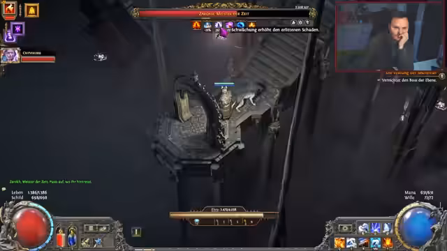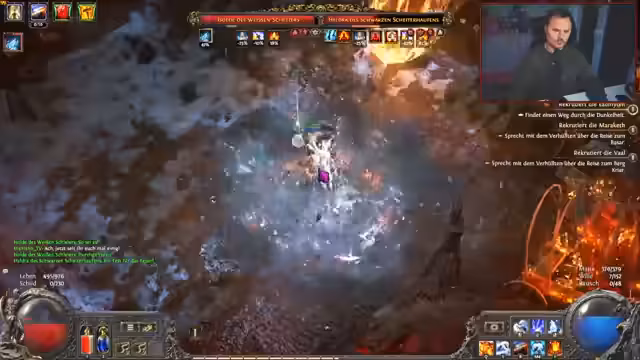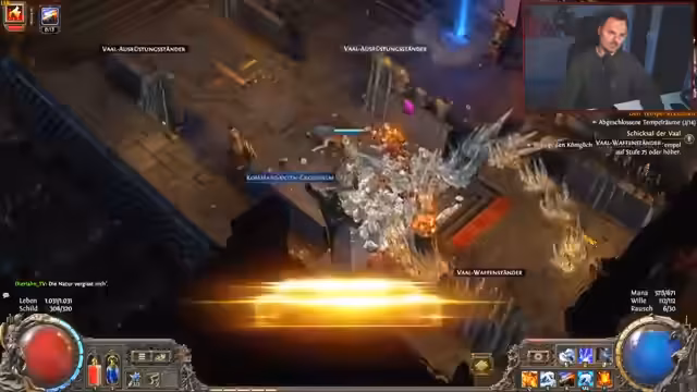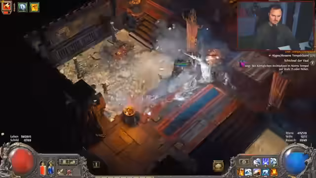 00:31:05Während der Tempel-Exploration zeigt sich der Build im Kampf gegen 'Schollender Tempel'-Gegner. Trotz technischer Schwierigkeiten ('Kann ich den Raum nicht verlassen') werden Loot-Chancen diskutiert. Der Streamer sammelt Legendaries und bewertet deren Nutzen für den Build. Diskussionen drehen sich um Ressourcenmanagement (Fokus, Mana) und strategische Entscheidungen bei Schatzkammern, wobei die Explosionsmechaniken effektiv gegen Gruppen eingesetzt werden.