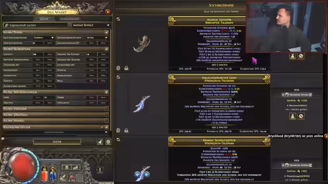 01:14:46Aktivitäten auf dem Marktplatz zur Aufrüstung des Builds. Der Streamer sucht nach Waffen mit hohem Schaden (DPS) und spezifischen Mods wie 'Kälteschaden', 'Angriffsgeschwindigkeit' und 'kritischer Trefferchance'. Er vergleicht Angebote, filtert nach 'Chaos-Schaden' und bewertet die Kosten-Nutzen-Rechnung verschiedener Gegenstände. Ein Fokus liegt auf der Steigerung der Explosions-Effectivität durch bessere Basiswerte.