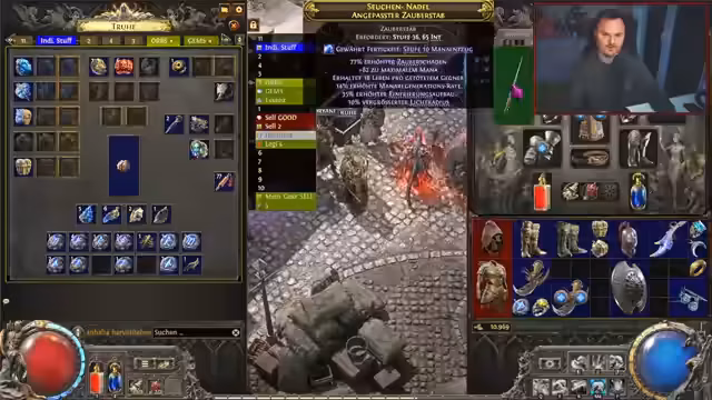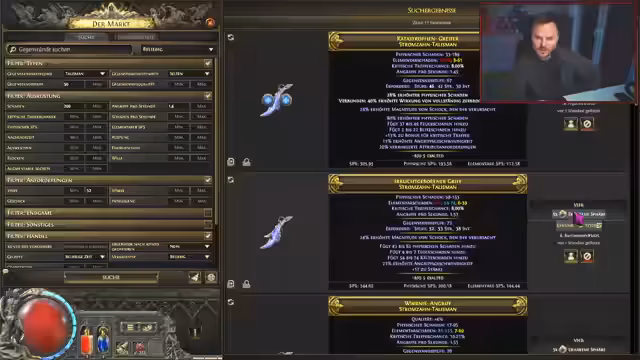 02:08:30Gezielte Suche nach besseren Waffen auf dem Marktplatz mit Fokus auf physischen Schaden, Elementarschaden und Angriffsgeschwindigkeit. Der Streamer kalkuliert DPS-Werte ('Schaden pro Sekunde'), vergleicht Preise und führt Käufe durch. Er optimiert die Ausrüstung, um die Explosions-Schadensausbeute zu maximieren, und testet neue Item-Kombinationen direkt im Gameplay auf Effizienz.