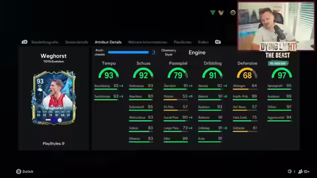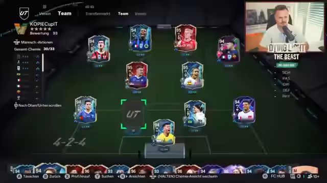 02:01:27Die erste Hälfte des Streams widmet sich intensiven Diskussionen über FIFA Ultimate Team. Der Streamer analysiert die Wirksamkeit verschiedener Spieler wie Speer, Upamecano und KDB und beklagt, dass der Evo-Wert bei Spielern wie KDB durch Upgrades nutzlos geworden sei. Es werden diverse Taktiken wie 4-2-1-3 und 4-2-4 getestet und ihre Eignung für den Erfolg in Rivals-Spielen bewertet, wobei sich der 4-2-1-3-Stil als besonders effektiv herausstellt.