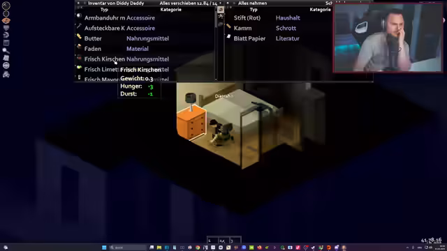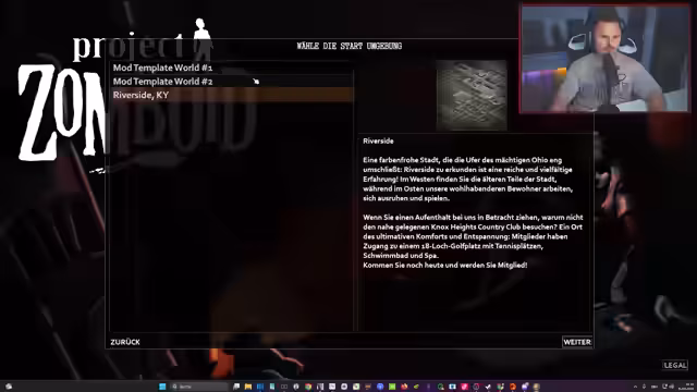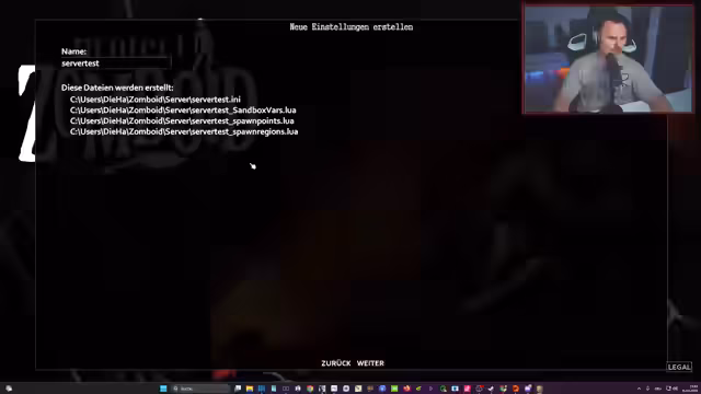 03:22:13Der Streamer startet das Spiel Project Zomboid und initialisiert einen Server. Er beginnt mit der Charaktererstellung, wobei er sich für den Beruf des Arztes entscheidet und seine Eigenschaften verteilt. Gleichzeitig wählt sein Mitspieler Daniel seine Rolle als Einbrecher und Handwerker. Der Streamer erkundet zu Beginn das Inventar eines Hauses, sammelt Nahrungsmittel wie Pfannkuchen, Cracker und Marmelade und macht sich auf die Suche nach seinem Mitspieler.