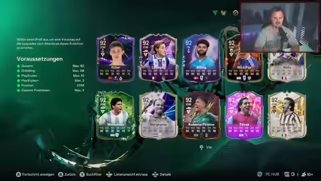 02:11:28Der Streamer ist sichtlich verärgert über seine wöchentlichen Belohnungen im Spiel. Obwohl er 11-1 in der Liga erreicht hat, zieht er nur mittelmäßige Karten wie Alexia Putellas und Konaté, was er als absoluten Scam und absurd empfindet. Gleichzeitig preist er die Stärke von Spielern wie Werner im Sturm, deren Schuss und Bewegung im Spiel als übermächtig beschrieben werden. Er gibt Tipps zur optimalen Positionierung im Team und versucht, seinen Zuschauern mit Umtauschaktionen zu helfen.