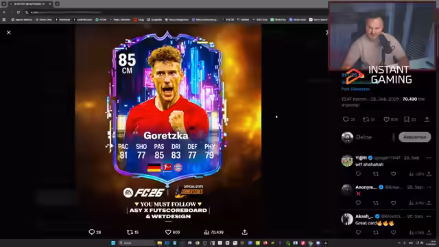00:28:48Nach einem Blick auf die offiziellen Werte von Zubimendi und Goretzka (Rating: 81, 77, 85, 83, 87, 79) wird der Wert der Goretzka-Karte diskutiert. Zwar hat Goretzka weniger Pace, ist aber im Passen und Schuss stärker. Dennoch ist die Karte nicht überragend, und es besteht die Sorge, dass sie in FC 25 eine hohe Chemie benötigt, was den Preis enorm in die Höhe treiben könnte. Der Streamer schätzt, dass die Karte trotzdem um die 100.000 Credits kosten könnte.