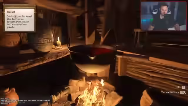 02:52:25Eine idyllische Szene wird durch einen plötzlichen Überfall unterbrochen, der in einem Kampf und der Flucht endet. Der Streamer stirbt und muss eine Reanimation durchlaufen, was ihm wertvolle Fertigkeits- und Spezialisierungspunkte kostet. Er wird in einer Hütte gefunden und erhält die Anweisung, sich zu erholen, Leichen zu beseitigen und ein Heilmittel herzustellen.