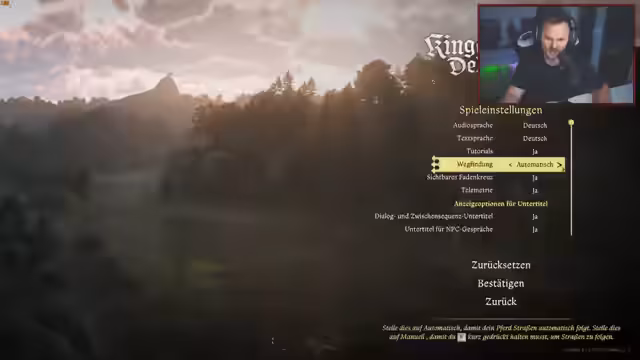 01:25:16Nach intensiven FIFA-Tests wechselt der Stream zu Kingdom Come: Deliverance 2. Es werden die ersten Eindrücke des Spiels geteilt, Grafikeinstellungen wie DLSS und FPS-Limits werden konfiguriert. Der Streamer, der die Rolle eines Adeligen annimmt, befindet sich am Anfang des Spiels und interagiert mit verschiedenen NPCs, um die Handlung voranzutreiben und die Spielwelt zu erkunden.