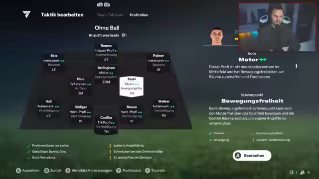 01:59:45Es beginnt mit der Frage, ob Evo Havertz ins Team soll, obwohl ihm Passplaystyles fehlen. Es wird überlegt, Pirlo zu testen, und seine Leihkarte wird aktiviert. Ein 82er Team wird zusammengestellt, wobei Schwierigkeiten bei der Beschaffung passender Ratingkarten auftreten. Es wird kurz diskutiert, ob die Evo verbuggt ist und ob Pirlo als ZOM eingesetzt werden kann. Die Frage nach dem idealen Chemistry Style für Pirlo wird aufgeworfen, wobei Anchor zunächst bevorzugt wird. Es folgen Überlegungen zur Taktik, einschließlich falscher 9 und Innensturm. Ein Problem mit den Playstyles bei den IQ Futures Evo wird festgestellt. Die Ausdauer einiger Spieler wird kritisch betrachtet. Es wird erwähnt, dass das Spiel Bayern gegen Bremen bevorsteht, wobei Bremen möglicherweise mit einer B-Elf antritt. Der Streamer justiert Trainereinstellungen und wundert sich über sichtbare Linien auf dem Spielfeld. Rodgers fühlt sich schneller an als erwartet, was die Vorfreude auf seine LM-Karte steigert. Es wird kurz über Gucci Prime & Evo gesprochen. Ein Problem mit der Playstyle Evo wird erwähnt, bei der ein falscher Playstyle auf einen Stürmer angewendet wurde. Bellingham-Totti wird als 'okay' bewertet. Abschließend wird festgestellt, dass sich Roger gut anfühlt, besonders im Hinblick auf seinen Body-Type.