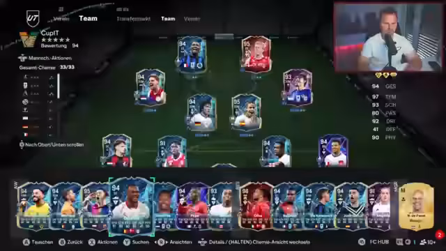 00:26:20Der Fokus liegt auf dem aktuellen Stand in FIFA 25 Ultimate Team. Der Streamer analysiert die Karten der neuen La Liga ToDs, wobei Spieler wie Laminia, Kimmich und Petri positiv hervorgehoben werden, während Anthony SBC als 'Totalausfall' kritisiert wird. Es werden diverse Spieler-Kombinationen getestet, wie z.B. Lewandowski und Thüram in einer Sturmformation, die er als 'geisteskranke Stürmerkombination' bezeichnet. Die Thematik der Chemstyles und Antrittstypen wird angesprochen, die der Streamer für entscheidend hält, da sie sich massiv auf das Spielerlebis auswirken.