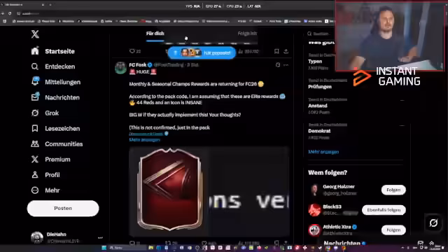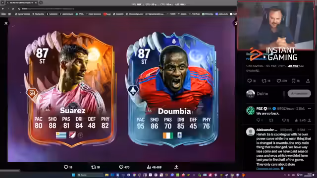 00:23:04Der Stream beginnt mit einem Willkommen zum neuen Abend. Es werden Leaks zu FIFA/EA FC diskutiert, darunter neue Spielerkarten wie Lampard und deren Stats. Besonders hervorgehoben wird das offizielle Scream-Event-Design, das als krass und nostalgisch bewertet wird. Es gibt Diskussionen über Live-Upgrade-Karten und deren Anbindung an Vollmond-Events. Einleitend wird der Fokus auf anstehende Themen gelegt, während aktuelle Marktentwicklungen und fehlender Content kritisch betrachtet.
