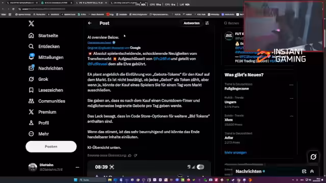 00:26:07Es folgt eine tiefgehende Analyse des Marktes, der als tot und kämpferisch beschrieben wird. Die sinkende Kaufkraft und der Einfluss von state-backed clubs werden diskutiert. Die Diskussion dreht sich um die Auswirkungen von Shop-Packs auf den Markt und die Schwierigkeiten, ohne Trading voranzukommen. Kritik wird an EA geübt, da der Markt nach Release schnell einbricht und Spieler durch fehlende Belohnungen bestraft werden.